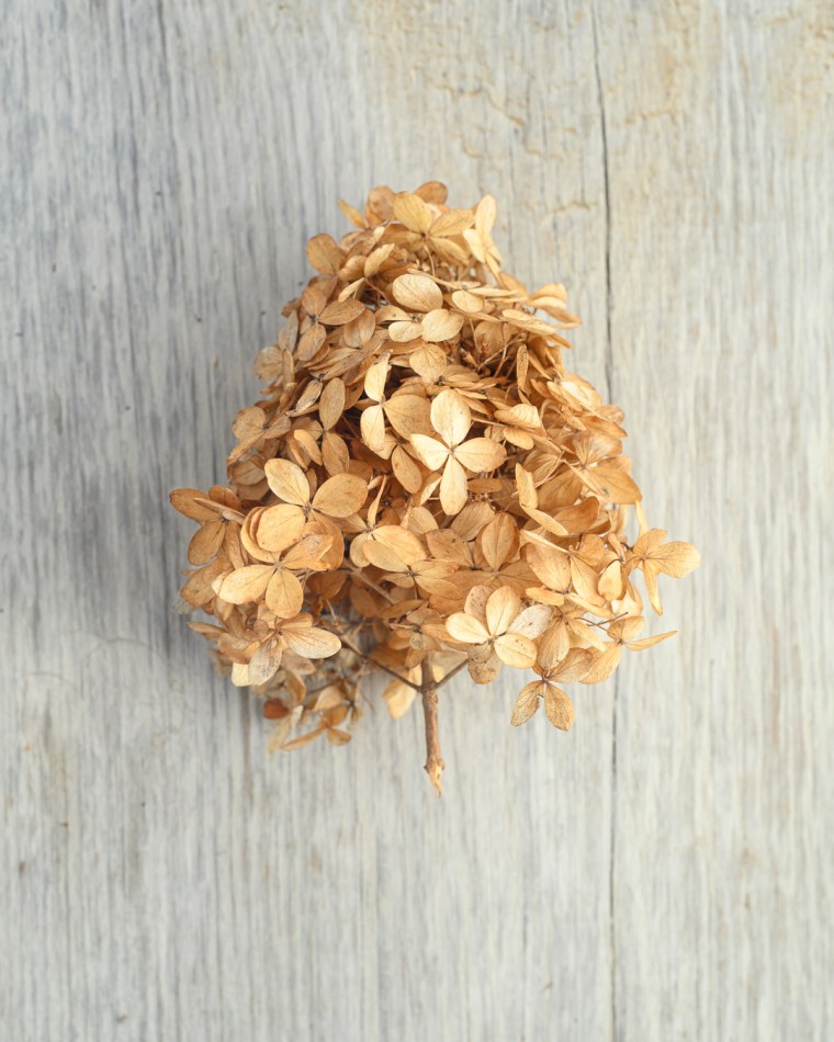 I found two hydrangea flowers while foraging for plant material. They had broken off in the wind and were lying in my perennial flower bed. One had been smashed on one side, so that one was tossed aside. It will be composted in the spring. The other dried flower had a pretty triangle shape and was not tattered. This is not the same flower that was photographed covered in snow.