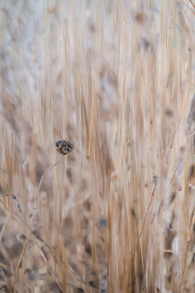 This next image is a multiple exposure (ME) made in Lightroom and Photoshop. One image was ICM (intentional camera movement) and the other a traditional image. The dried zinnia seed head was quite prominent, but even using a large aperture, the background wasn’t satisfying. The wind was a challenge, so I made it my friend. I used the wind and moved my camera. This allowed me to create an image that would make a great ME in post processing. The zinnia seed head in focus was the other layer. Using the screen blending mode, I was able to make the image below.