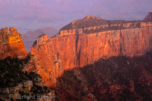 Last summer I had the opportunity to go to the North Rim of the Grand Canyon. It was a three-day photography workshop just for women and being held during the monsoon season. Opportunities for capturing monsoon storms, rainbows and horizontal rain were anticipated. The North Rim is quite different than the South Rim. While the vistas seem so far away on the South Rim, they are up close on the North Rim. The North Rim is also 1,000 feet higher in elevation.