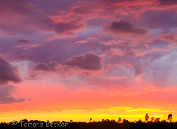 I first set up to capture the most incredible light on Wotan’s Throne. The rock had turned to an amazing red! The rain was coming from behind me. I then turned looking to the west to capture the most incredible sunset I had ever seen. Our instructor, Colleen Miniuk-Sperry, and I were giving each other high-five with excitement of horizontal rain! The type of rain we had hoped for in Acadia National Park about a month before. Although the rain was horizontal it wasn’t heavy. Hopefully light enough that my camera would not be damaged. I borrowed a cloth from one of the ladies to wipe off my lens. It’s quite a task to photograph in horizontal rain and keep your lens free of raindrops. Still we continued to shoot this amazing light. Without my graduated ND filter I knew the canyon walls and trees would be in silhouette. The sky was the story and I kept the canyon walls and trees to a minimum in order to capture as much of the sky as possible. The sunset was layers of color; yellow, orange, pink, blue and even purple. It was exhilarating!